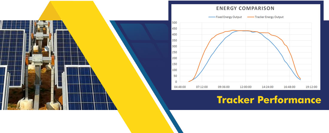 The graph above shows the actual energy gain on 26th May of our tracker installed at a plant in Telangana State, India in comparison to the energy generated by a fixed tilt system